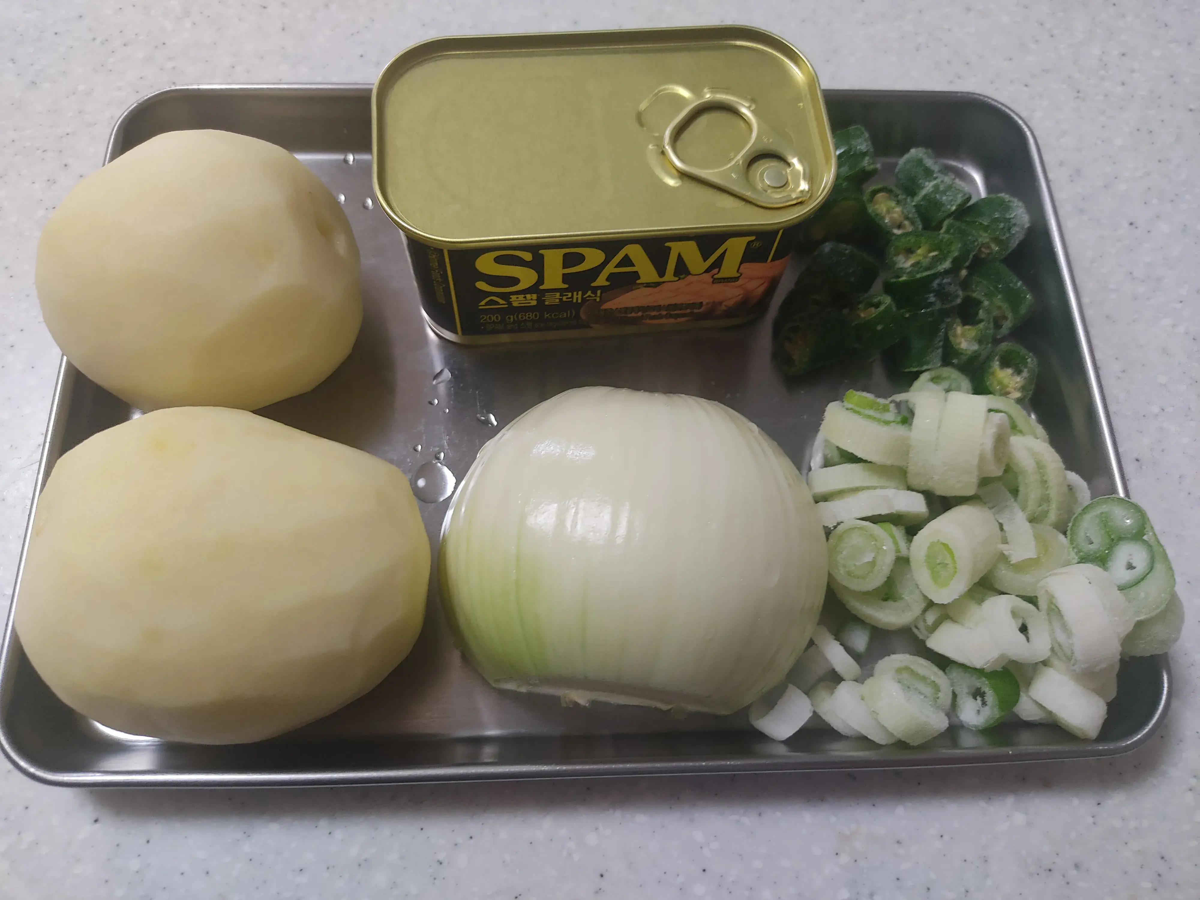 감자 짜글이 만들기 재료 : 감자, 양파, 대파, 통조림 햄, 청양고추, 두부